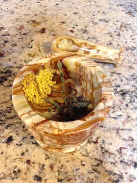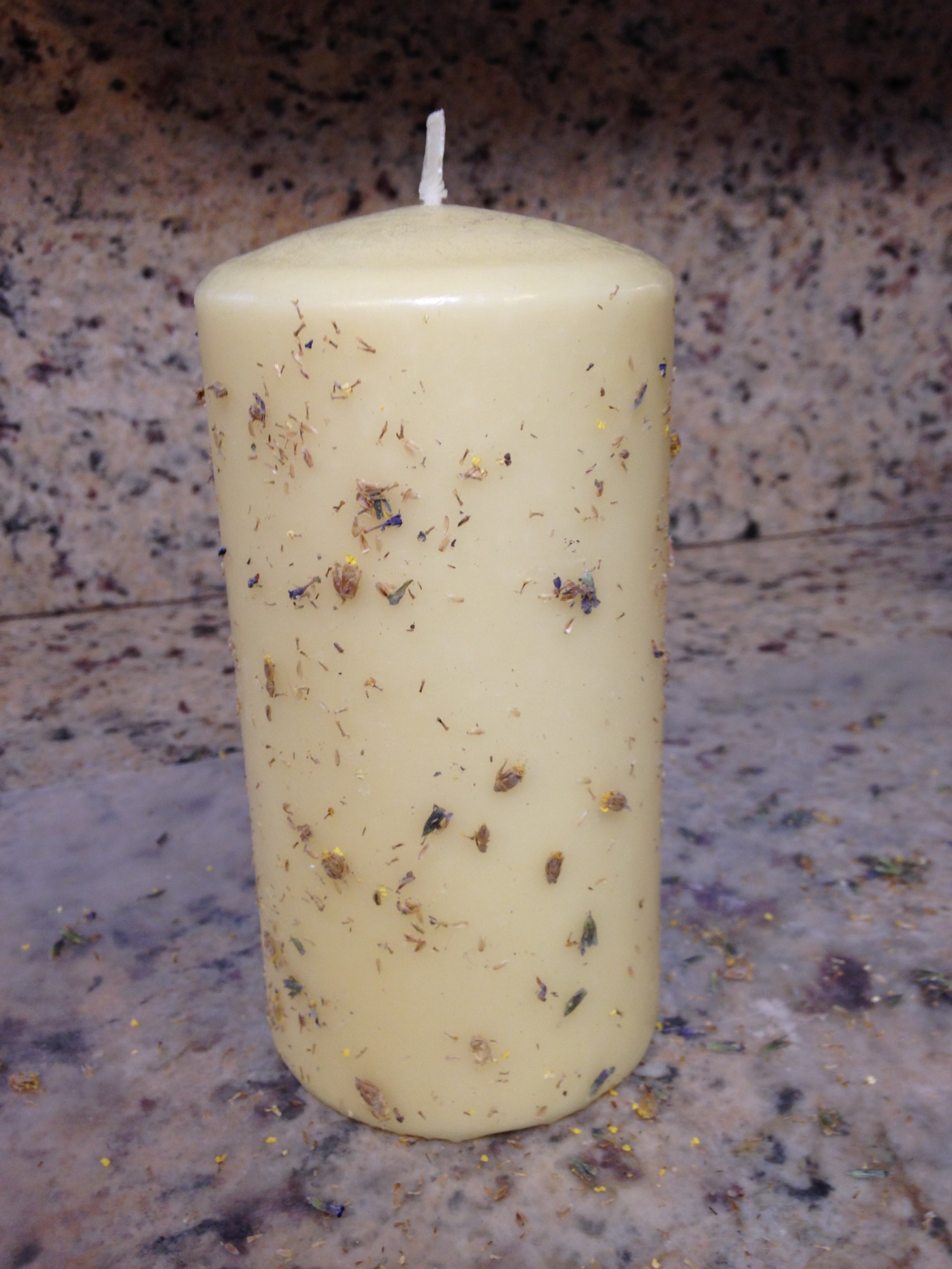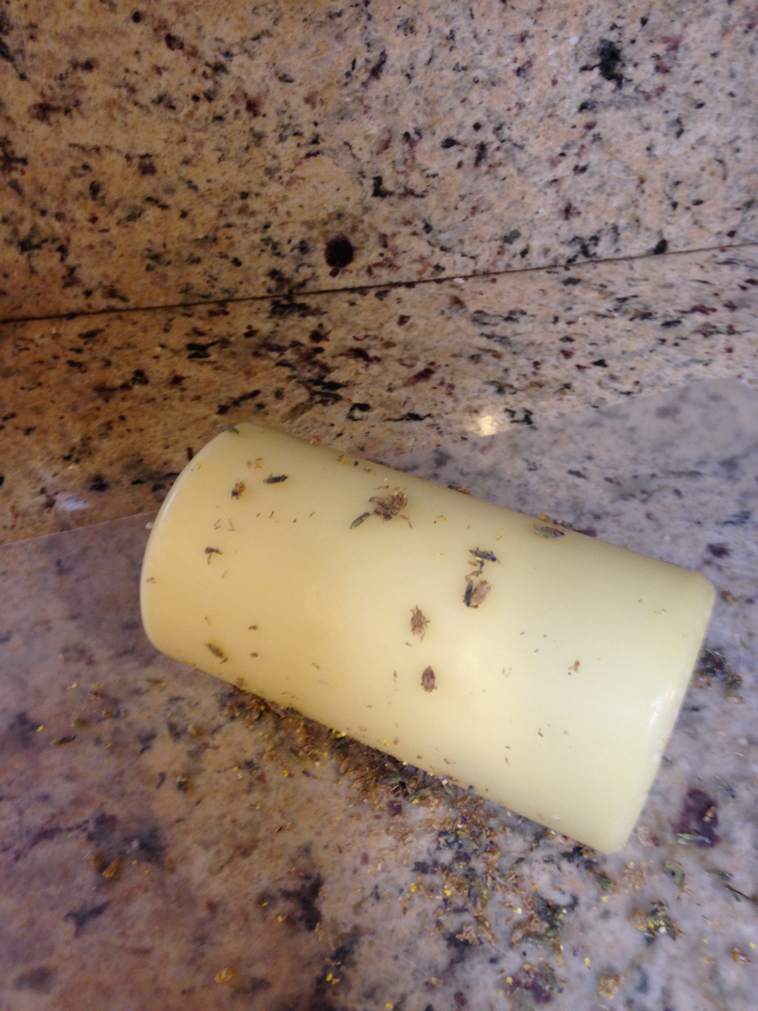 I wanted to add some dried herbs to my candle for cleansing and removing negativity so I ground up some dried lavender buds and yarrow flowers.