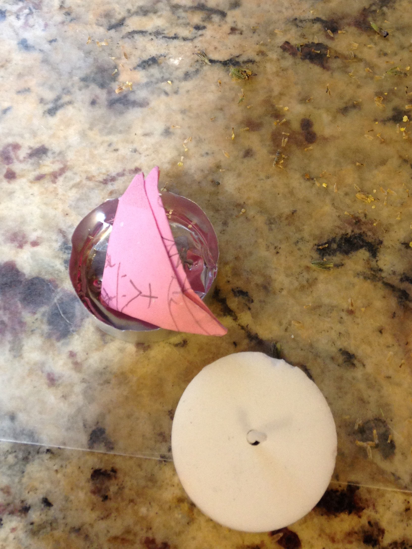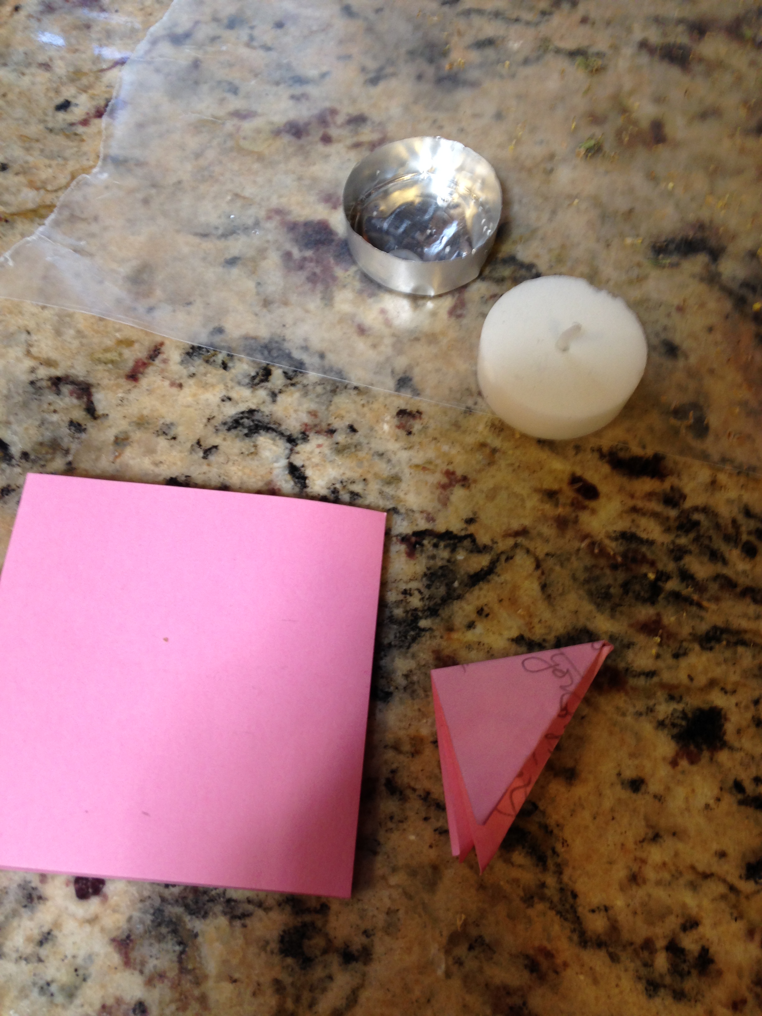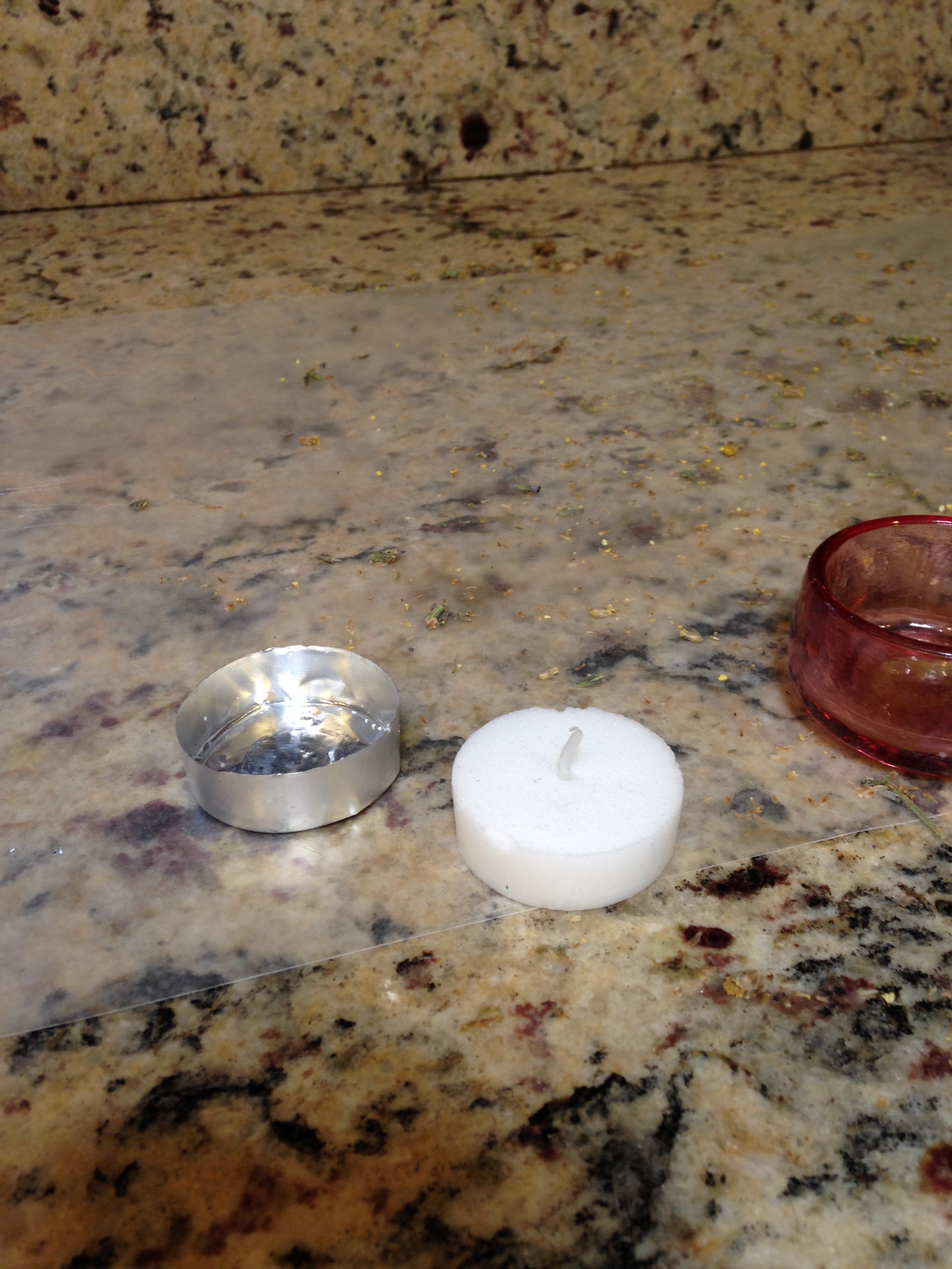 Write your charm on a small piece of paper and fold it three times into a triangle. Insert it into the candle cup and place the candle back in the cup on top of the paper petition.