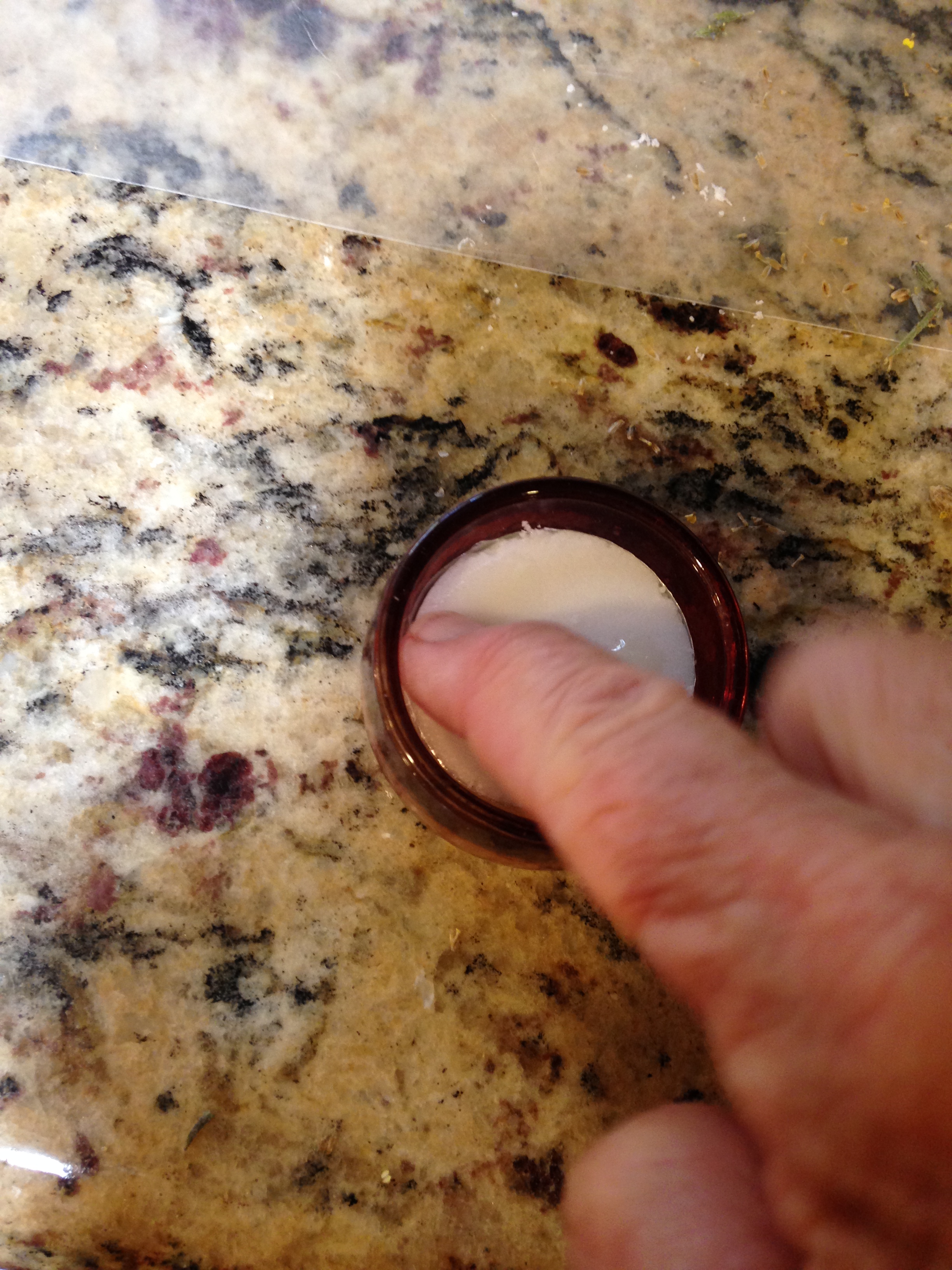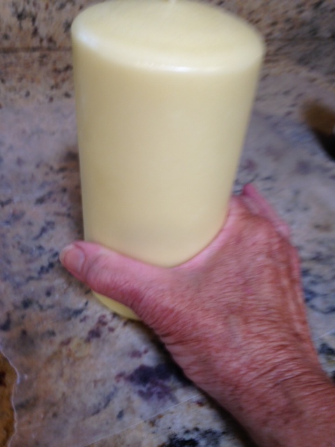 Next, I roll the candle in the crushed herbs. You want to press kind of hard to get the herbs to stick.