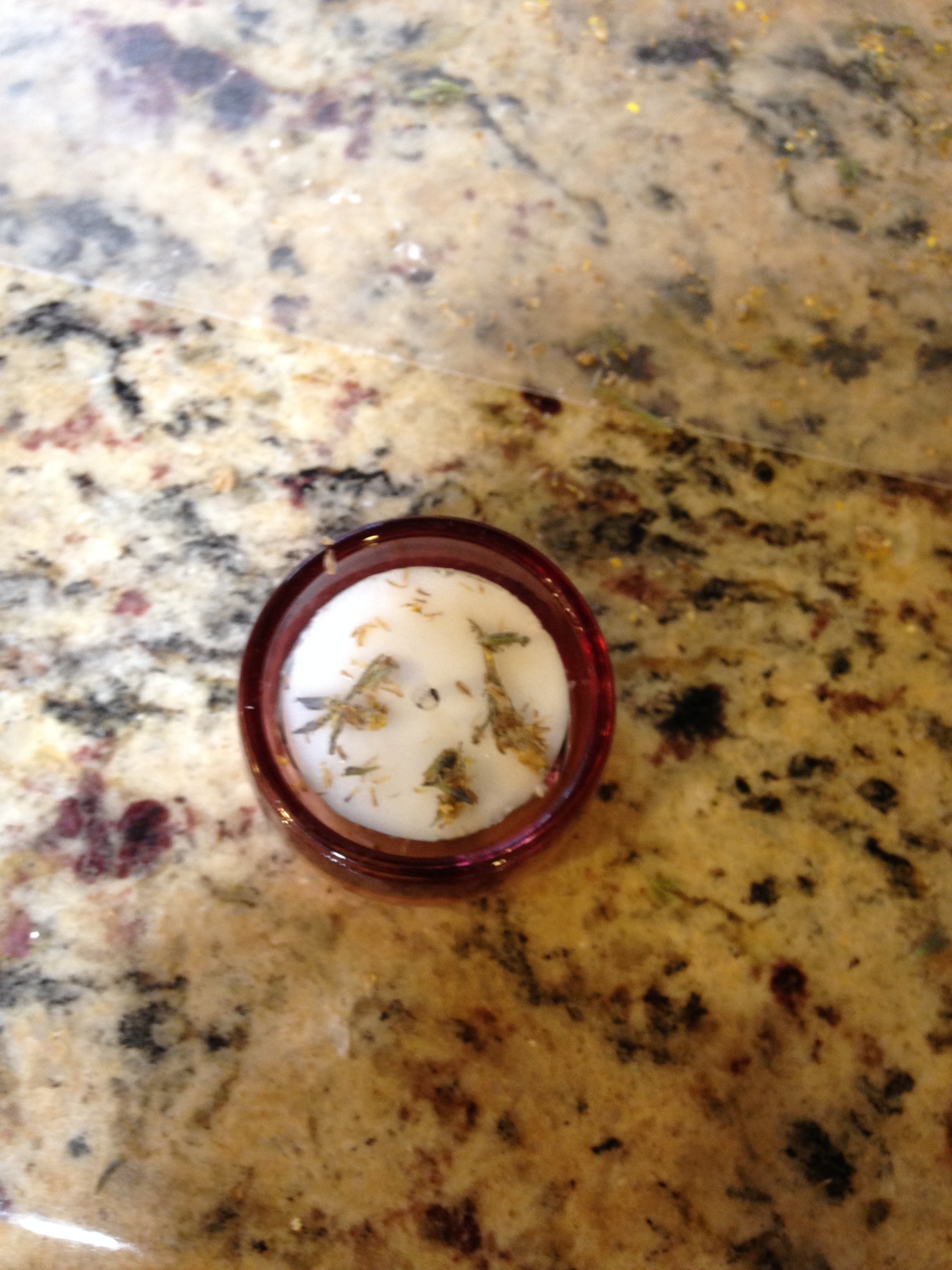 This charm is to remove obstacles to someone getting a job they applied for. I am working with Ganesha who is the Hindu elephant god that removes obstacles. I anointed the top of the candle with four thieves oil and topped with just a pinch of the dried herbs. Don’t add too many herbs or too much oil or you might start a fire!