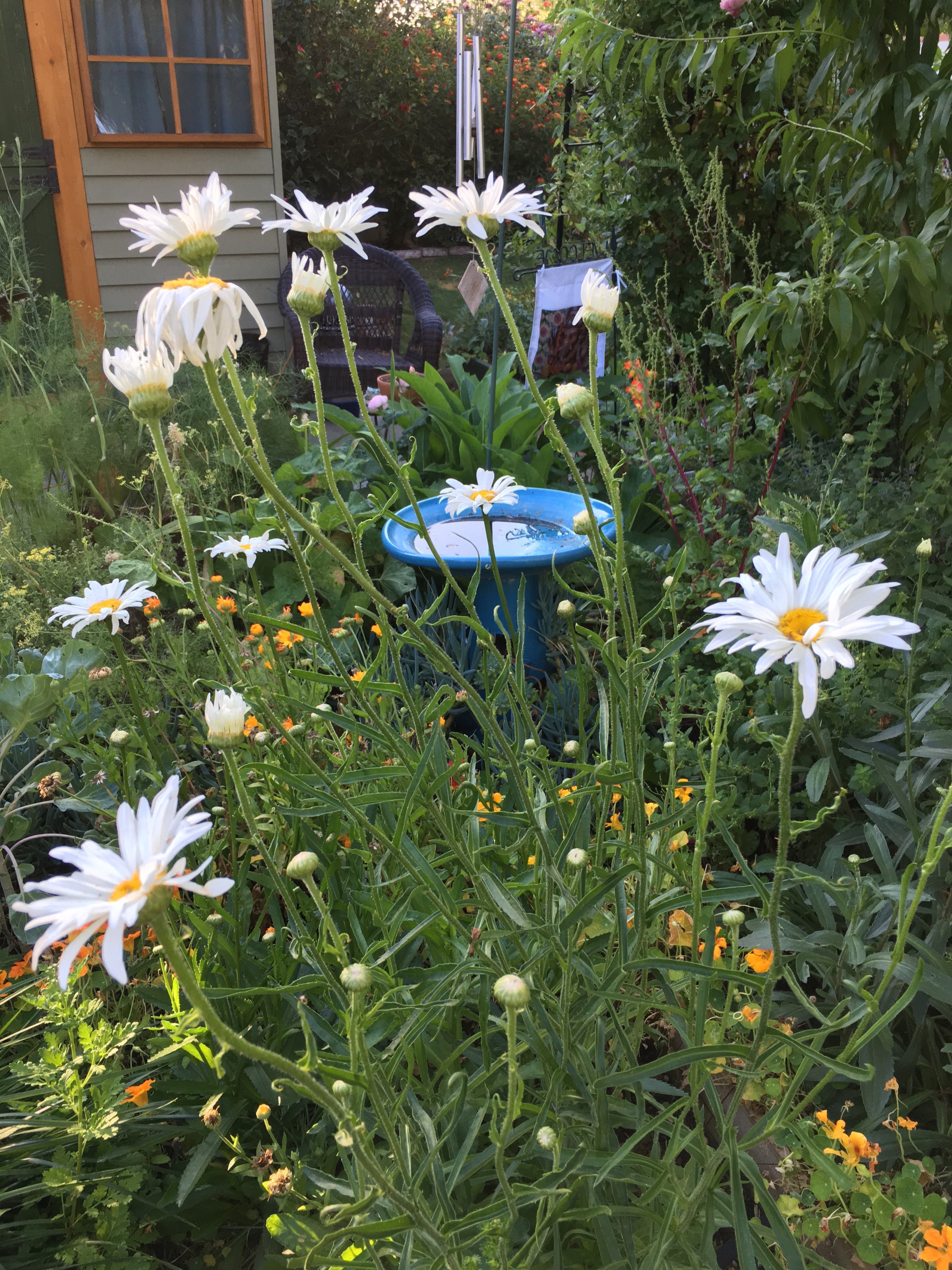Shasta daisies sprang up from wild flower seeds and are all over the place! So consider this: my new Shasta daisy familiars have that same solar shape as the rudbeckia but are a luminous white. That’s something worth meditating on! What changes have occurred in my life that are reflected in my plant familiar?
