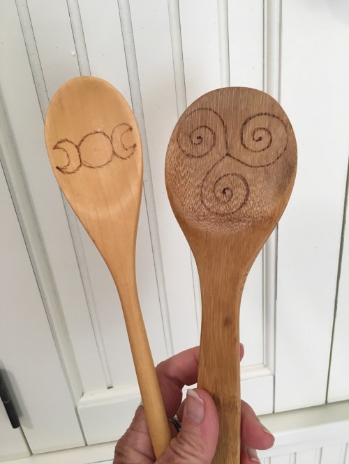 This sconce to Brighid by Mickie Mueller I bought on Etsy serves as a good kitchen altar and I have these lovely witchy kitchen wands that I display as well.