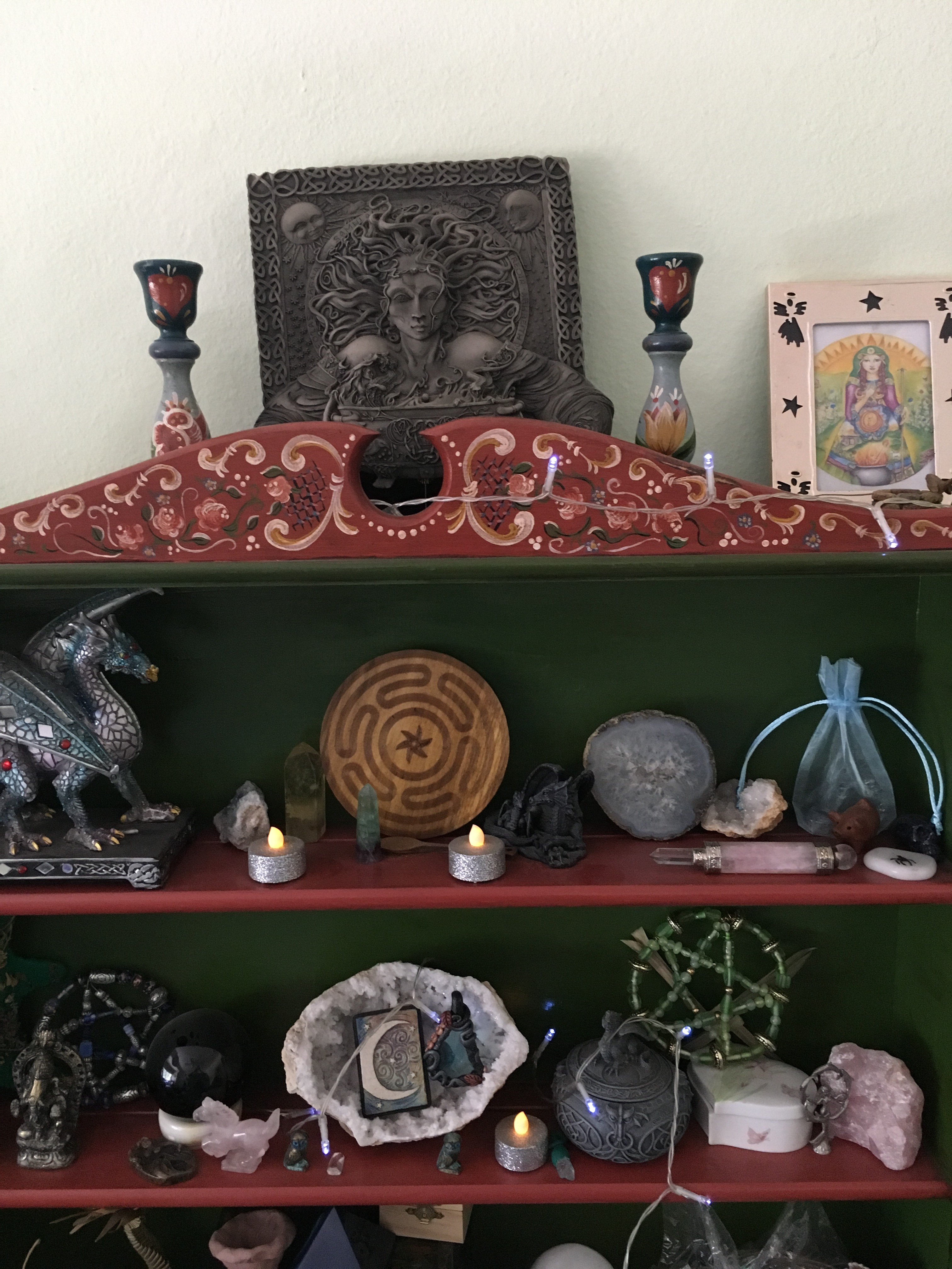 Above the shelves sits a bathroom cabinet I rescued from the street, cleansed and painted, and now a home for magickal oils.