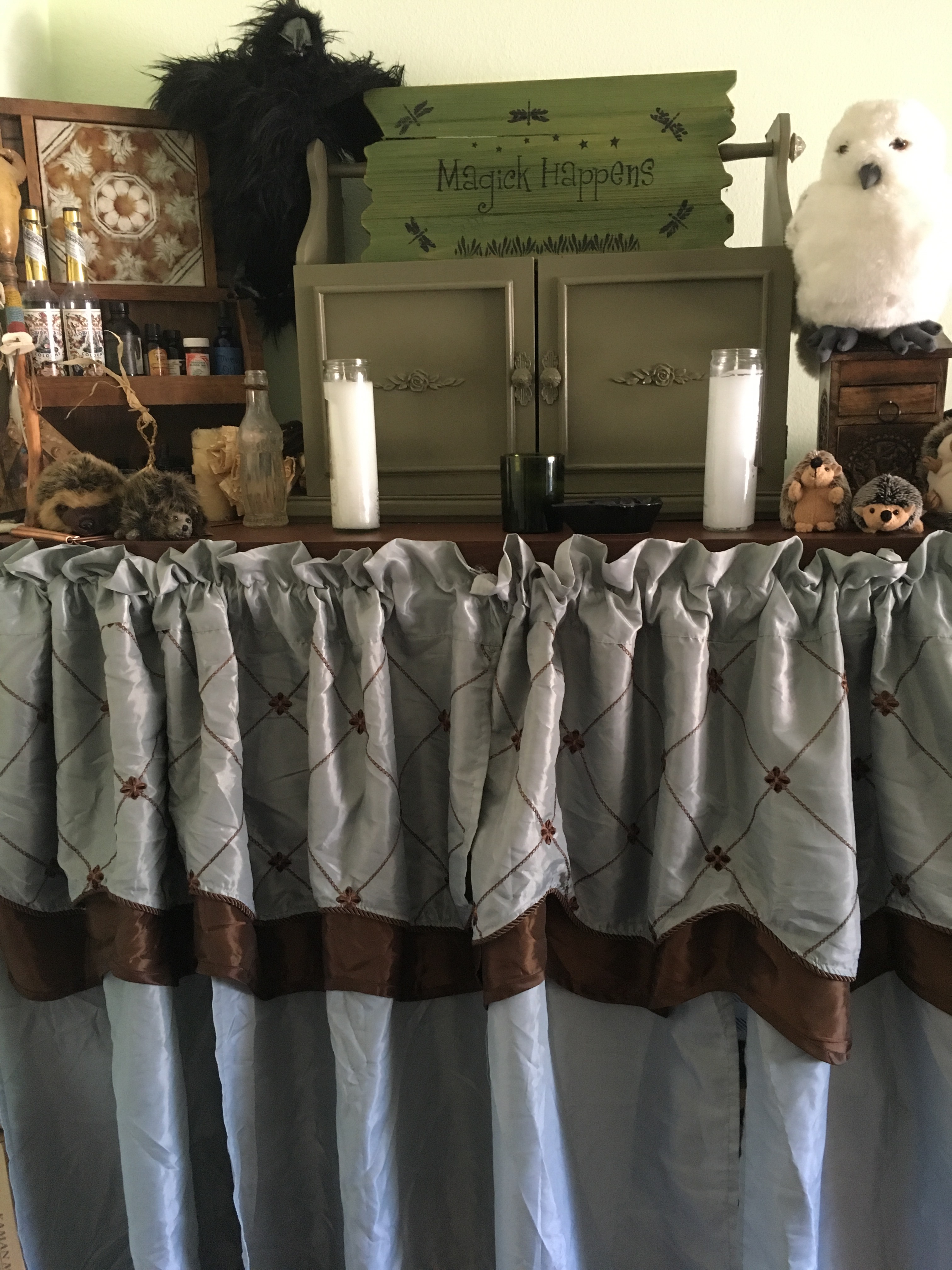 My mish-mash of craft supplies went on shelves behind some old curtains. I mounted some of those stick on removable hooks on either end of the shelves to hold a curtain rod. This one thing made the whole room easier on the eyes and gave things a more magickal feel.