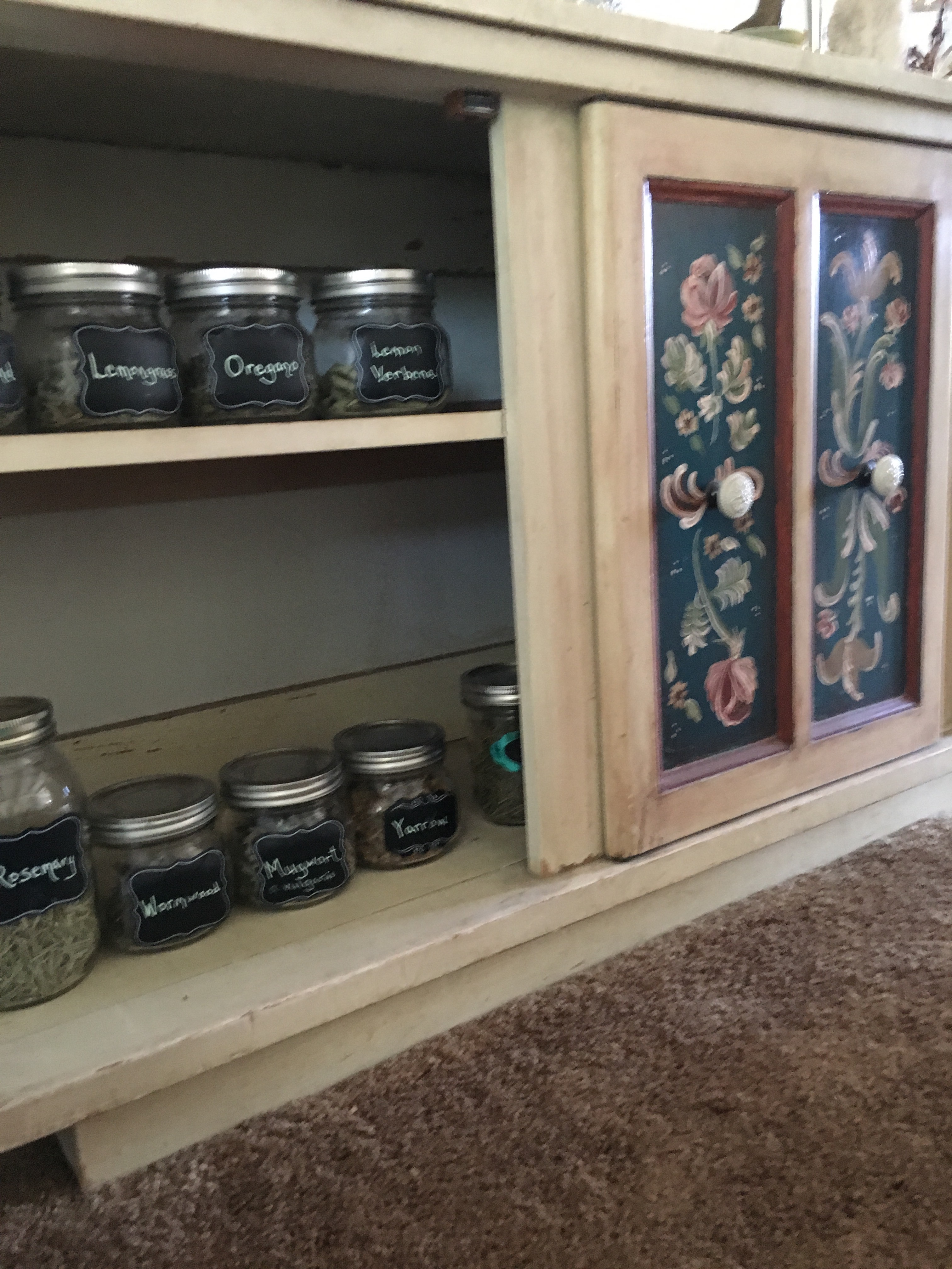 I organized my herbs and incense, and placed them in my painted cabinet. Ok, they aren’t in alphabetical order ….yet. Now I have everything I need in one place to make that Lughnasadh incense!