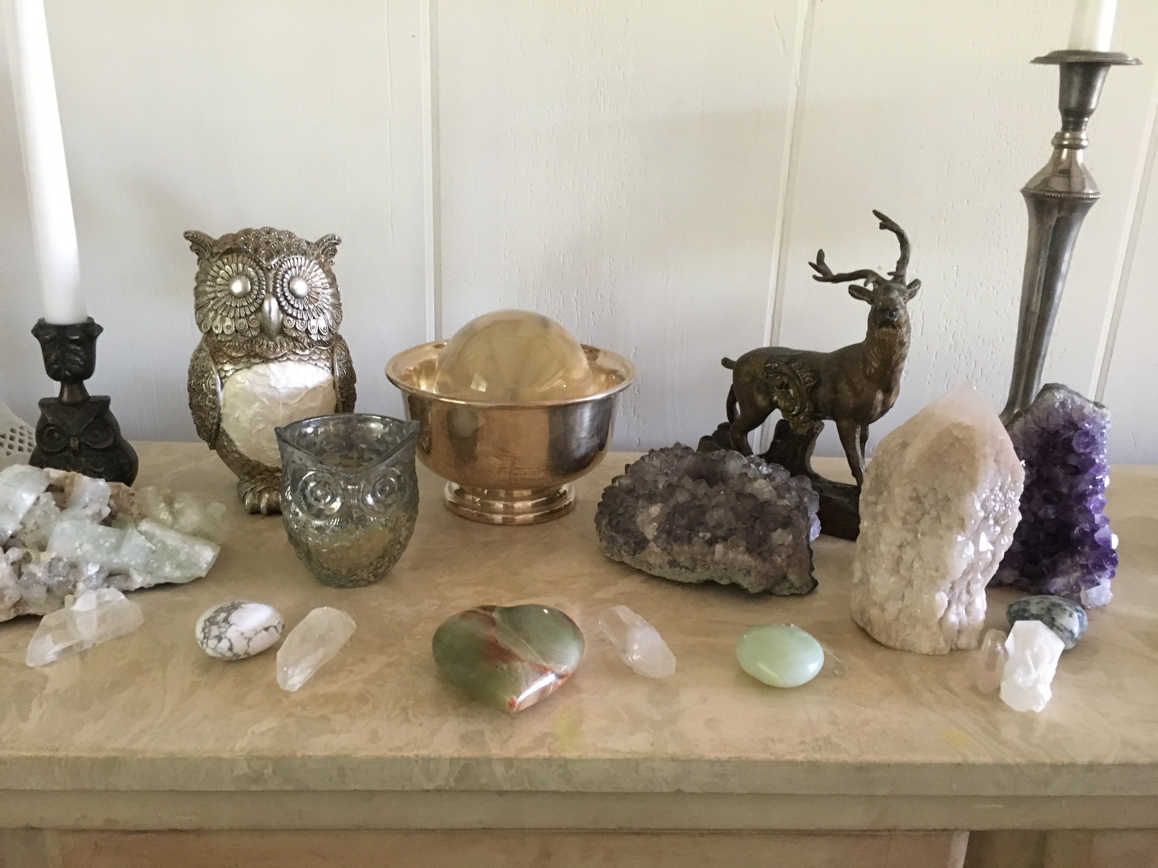 On top of the herb cabinet I’ve set up a formal altar to honor Cerridwen and Cerrnunos….the Owl and the Stag. No tools on this altar since it’s mainly a place for meditation …. and lovely crystals. Speaking of which, crystals should definitely be a part of every witchy home. I think our home has crystals in nearly every room.