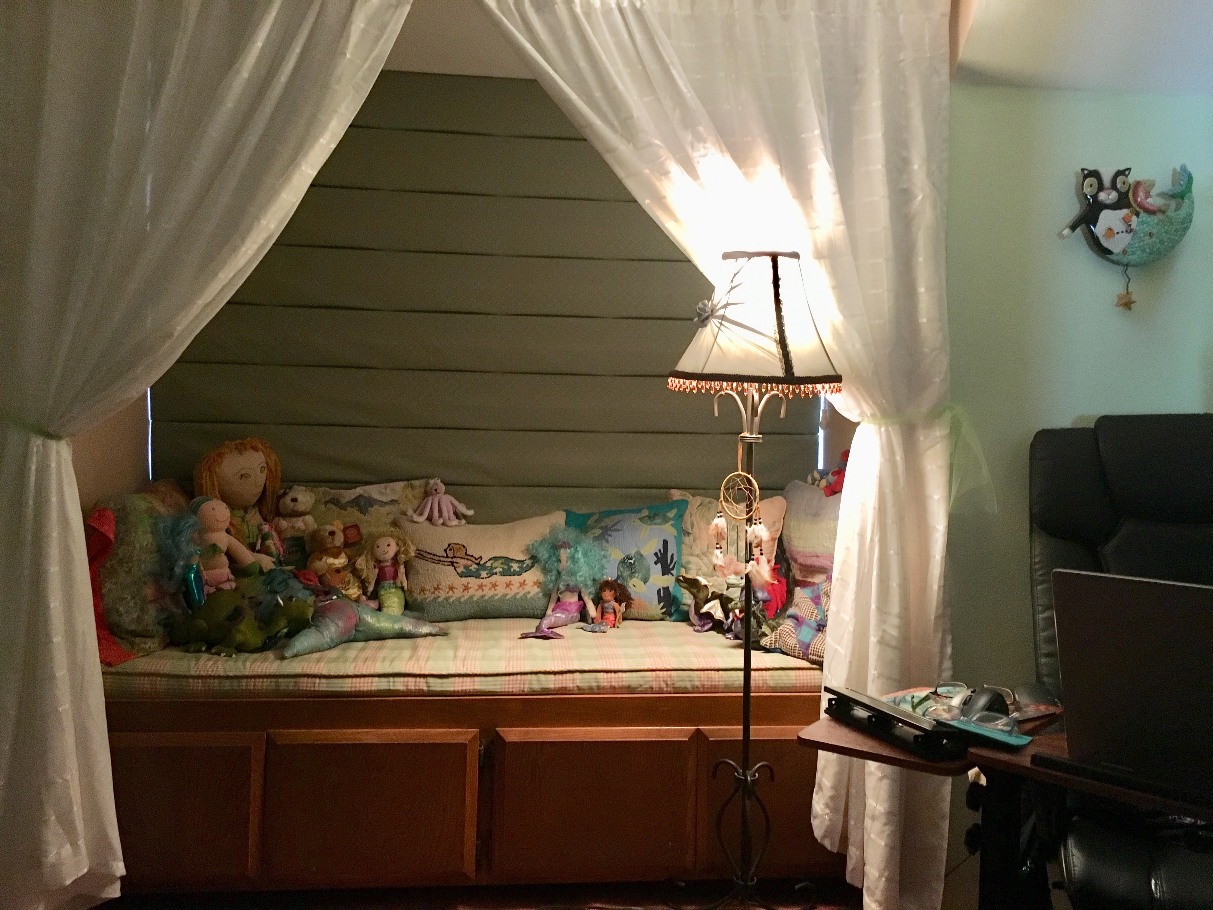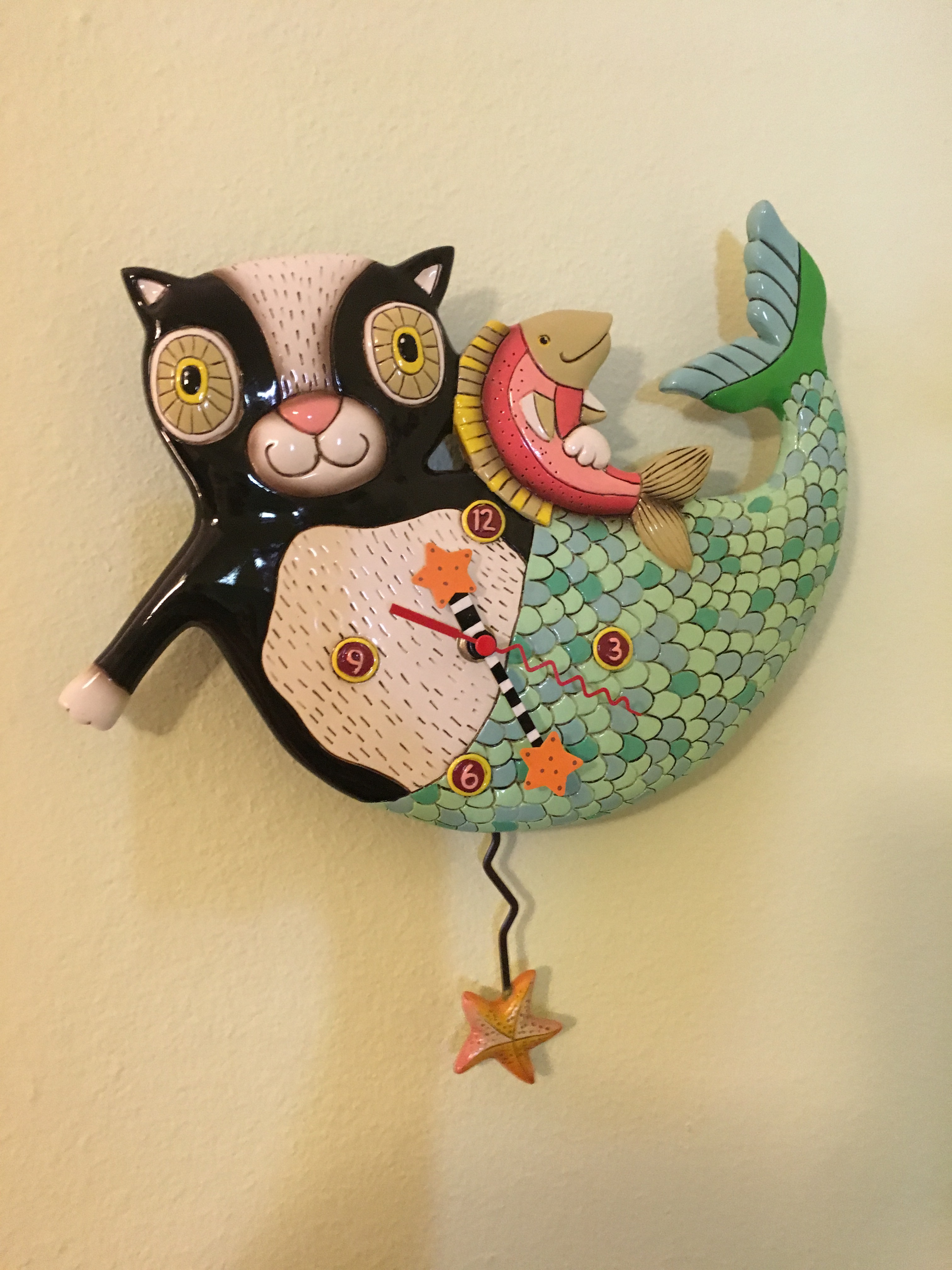 And, yes, I do have a thing about mermaids and dragons. Who doesn’t? The merkitty clock above my computer chair was a splurge from when we first moved in. Isn’t she lovely? My husband thinks she’s weird. Go figure!