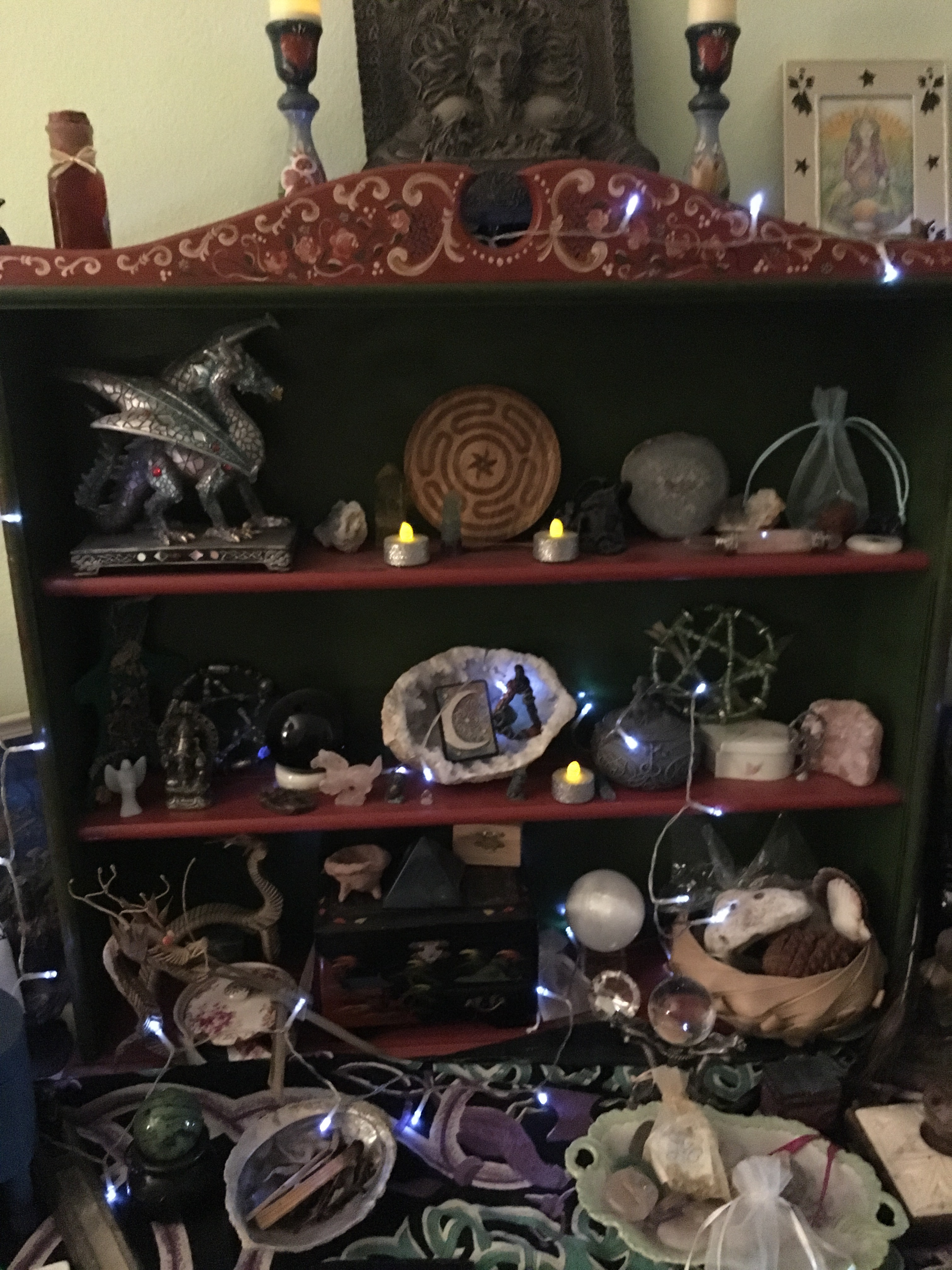 My working altar is where I will do most of my witchycrafting. I covered the craft table with a nice cloth and tidied things up. Still a lot of stuff there ….but most witches I know have a lot of STUFF. I think cleansing and organizing is the key.