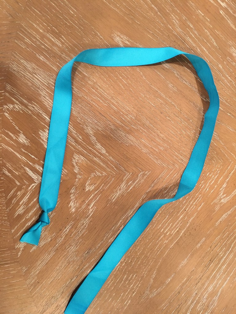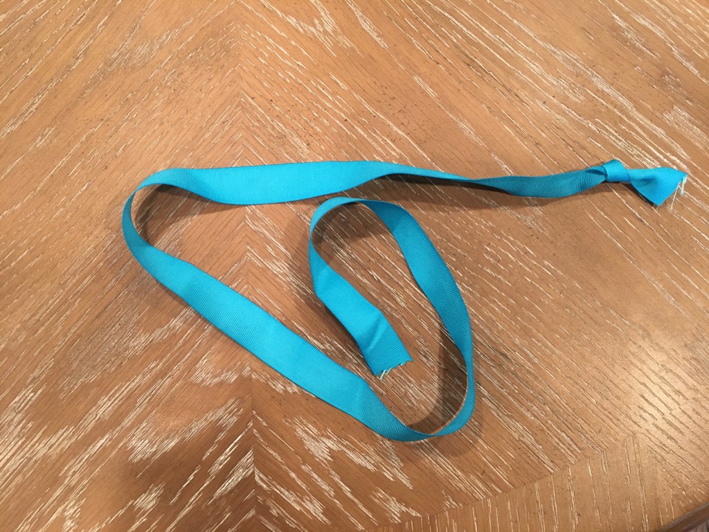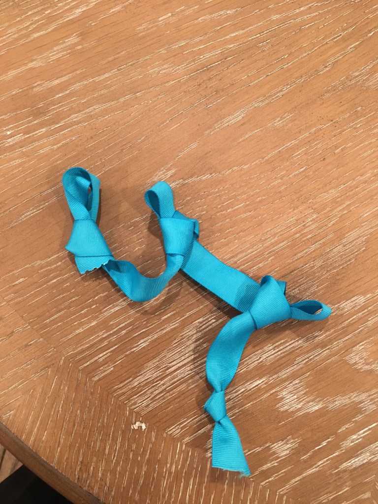 Under the light of the full moon start with a length of ribbon, yarn or cord about the length of your forearm or longer. Tie a knot in one end. I used blue to correspond to the blue moon.Cross the ribbon like you are tying a knot.Start to pull the ribbon through the hole but don’t pull in all the way through. Pull the loop of ribbon so it’s taut. You have created a slip knot. Tie two more to total 3 slip knots. You might want to practice tying some knots before you do the actual spell under the full moon.