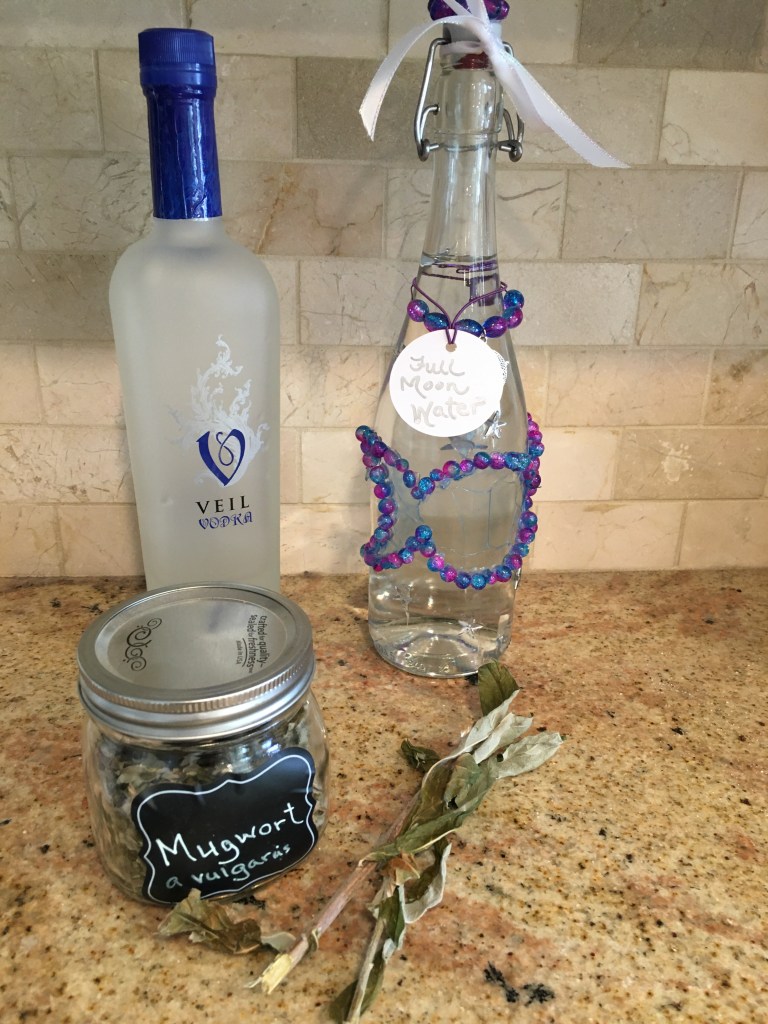 1/4 c vodka or everclear; 1/2 c dried mugwort (I’m using a combo of native mugwort and artemesia vulgaris ; 1 cup water (remember that moon water from my last post?) 😉You will also need 9 drops of colloidal silver