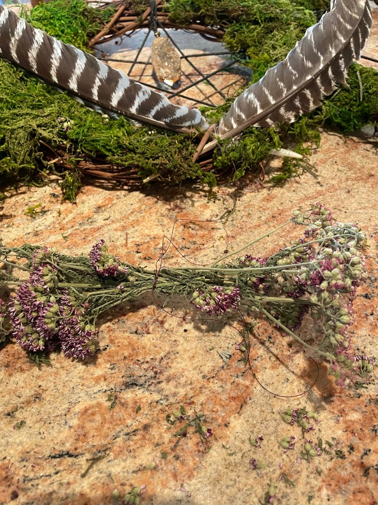 I gathered some dried garden herbs and a few feathers and started planning how to arrange things.