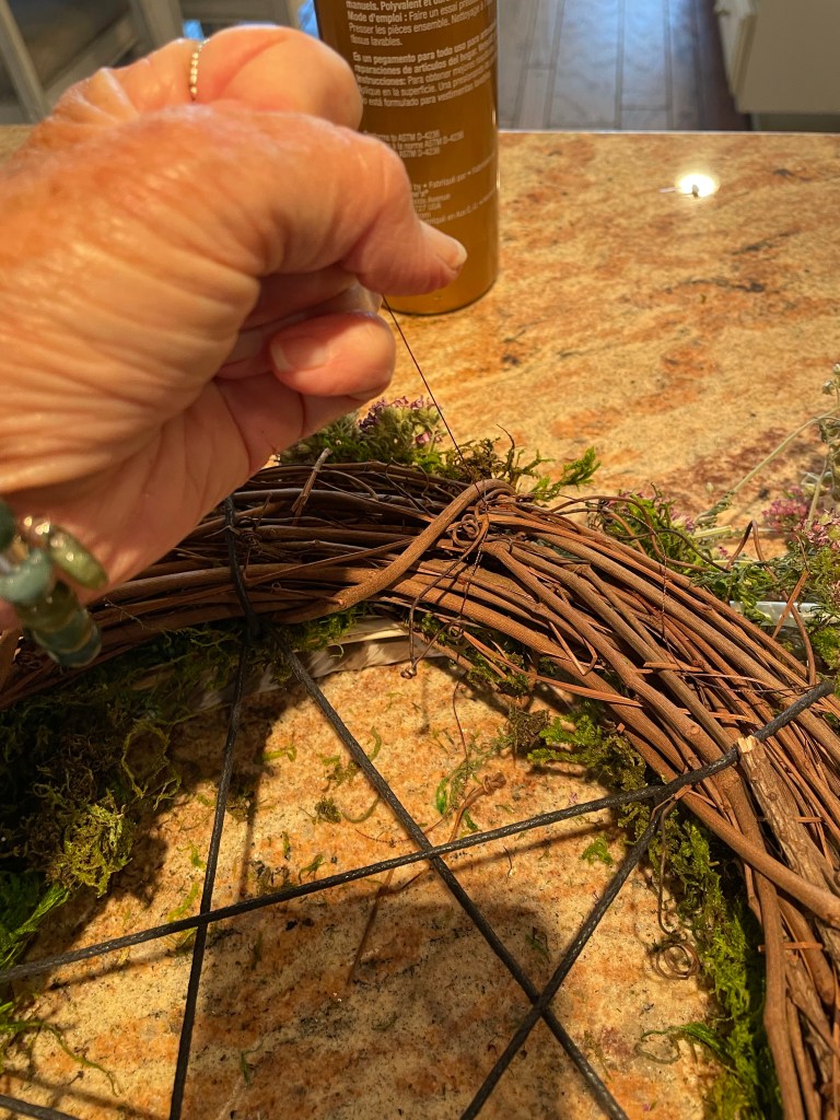 The herbs were easy enough to just poke through the grapevine wreath, and if it makes you feel better you can add a drop of glue to the ends of the herbs before inserting them for added strength.