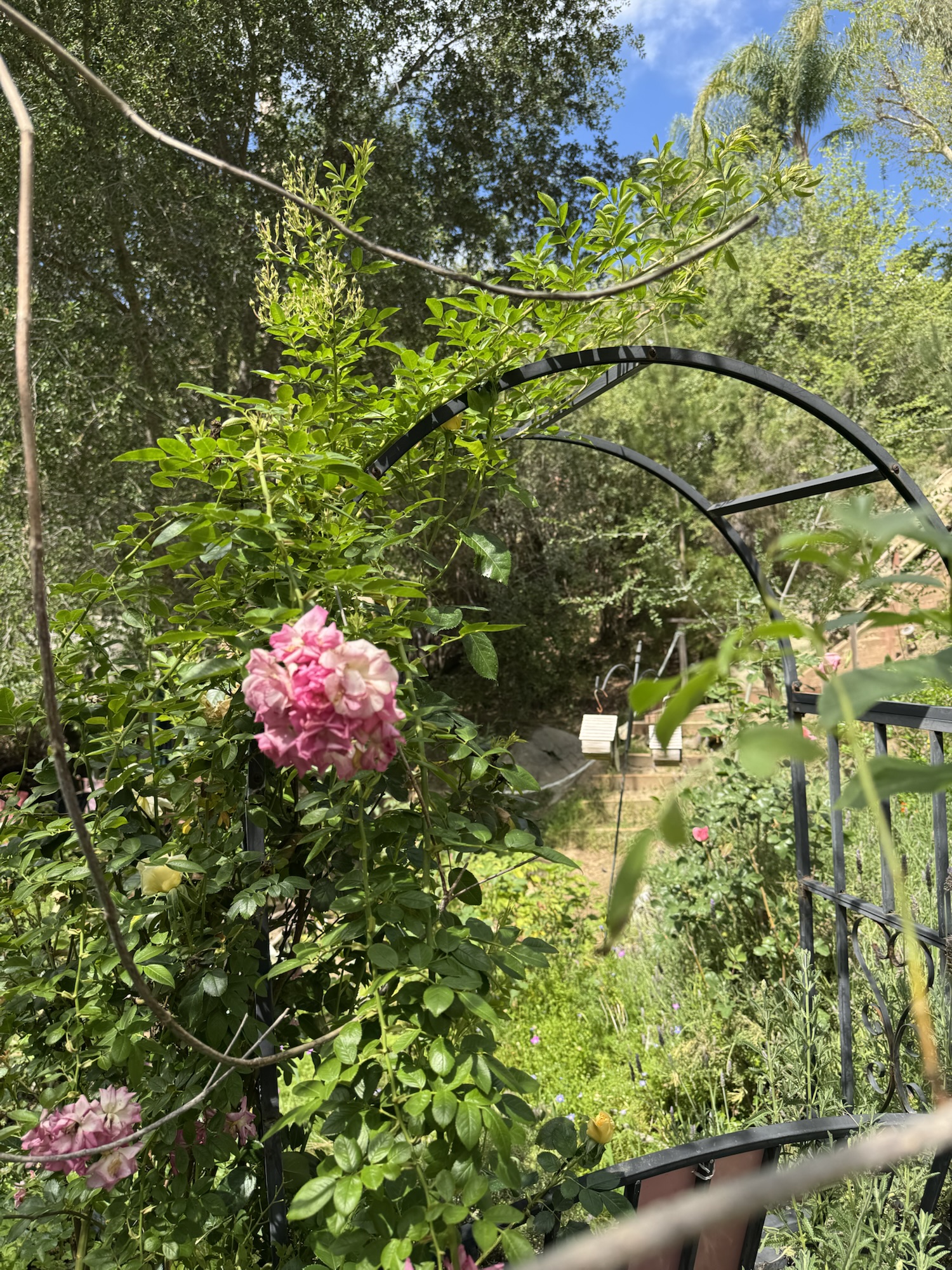 To improve the energy going to the front door and slow it down a bit, I added a garden arch to create a magickal portal. This will soften the energy and keep it from hitting the front door with such a hard force, and also create a magickal portal to filter what goes into the house. I have planted bower vine on either side which should grow nicely up and over the arch to enhance the energy even further.